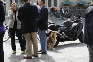 When I left the building, nine others were outside, waiting. (Check out this picture … the dog is yawning. Yes, we were bored … and quite taken with the dog. Sorry also that these photos aren’t cropped or toned. I need to add the right photo editing software to my laptop. Sigh.) We stood outside for awhile but were getting impatient and hungry.