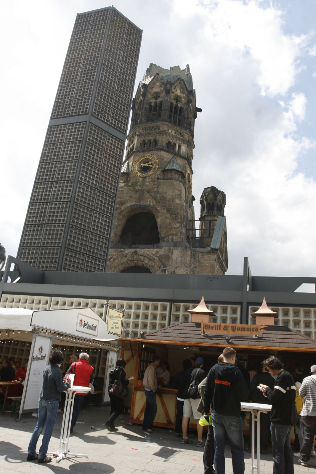 Freeman stayed behind to wait for the others and directed us where to go to get on the S-Bahn (think Marta, but cooler) to get to Kaiser-Wilhelm-Gedächtnis-Kirche, a church that was hit in 1945 during air raids. Another church is built beside it. It was interesting, seeing it surrounded by several food stands and touristy shops. I got an order of “pommes,” or fries. (From the little hut in the photo, on the right.) The prices were upped quited a bit, which made me think of Six Flags and tourists. (This isn’t the best photo I have of it, but I wanted to include one for the blog of the food stands next to it.)